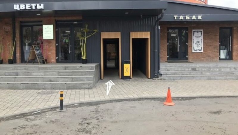 Вход в здание между цветочным магазином и табачной лавкой (левая дверь), 2-й этаж